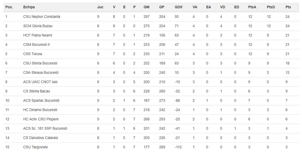 Celelalte rezultate: CS Danubius Călărași – CSȘ Tulcea 23-25 (9-13), ACS Șc. 181 București – CSM II București 26-41 (9-22), HCF Piatra Neamț – HC Activ Plopeni 28-24 (19-12), CNOT Iași – CSU Neptun Constanța 26-34 (9-21), Dinamo – SCM Gloria Buzău 28-29 (15-12), ACS Spartac București – CSU Știința București 17-38 (10-14); CSU Târgoviște a stat.