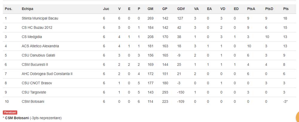 Etapa a VI-a, care a fost deschisă pe 1 noiembrie cu duelul CSU Galați – CSȘM Bacău 24-30 (11-16), s-a derulat în weekend cu următoarele rezultate: HC Buzău – CSM II București 24-19 (13-12), AHC Dobrogea II Sud Constanța – CSU Târgoviște 41-24 (20-11), ACS Atletico Alexandria – CSM Botoșani 41-20 (19-13), CNOT Brașov – CS Medgidia 29-31 (10-14).