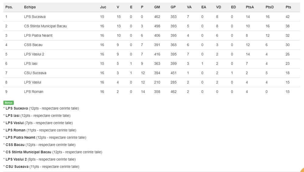 De partea cealaltă, CSȘ Bacău a înregistrat 2 victorii (32-17 cu LPS Iași, 27-23 cu LPS Piatra Neamț) și 1 înfrângere (28-29 cu CSȘM).