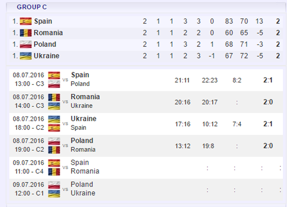 În primul meci din grupa C, „tricolorii” au învins Ucraina cu 2-0 (20-16, 20-17), după care au pierdut în fața Poloniei cu 0-2 (12-13, 8-19). În ultimul joc din faza grupelor, echipa României va întâlni Spania (sâmbătă, ora 13.00), în continuare urmând să se dispute partidele de clasament.